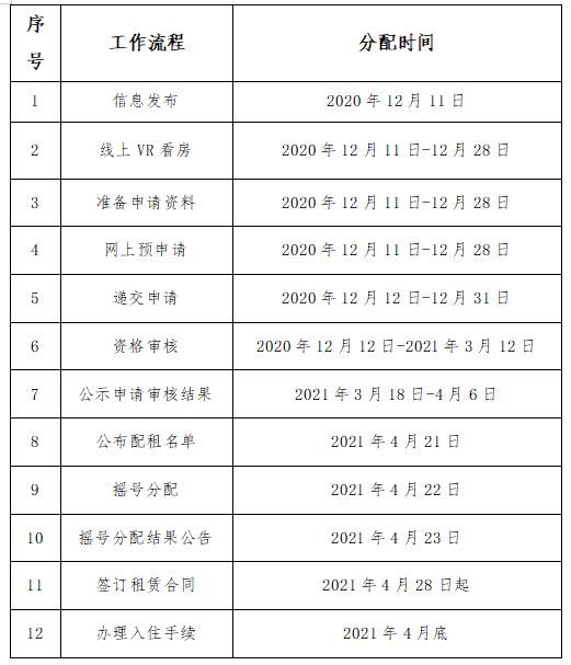 网上预申请——街镇窗口受理——街镇初审——区住房保障、来穗人员服务管理等部门会审——审核结果公示——公布配租名单——摇号配租及结果公告——签订租赁合同——办理入住。