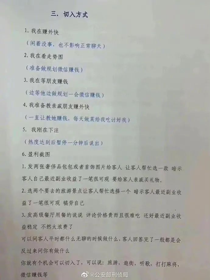 每一份剧本,都有30多个文档,详细阐述了如何建立好感、谈情说爱、如何洗脑,切入投资环节、钓大(诱导加大投资)。只要你能想到的,他们都有对应的话术。