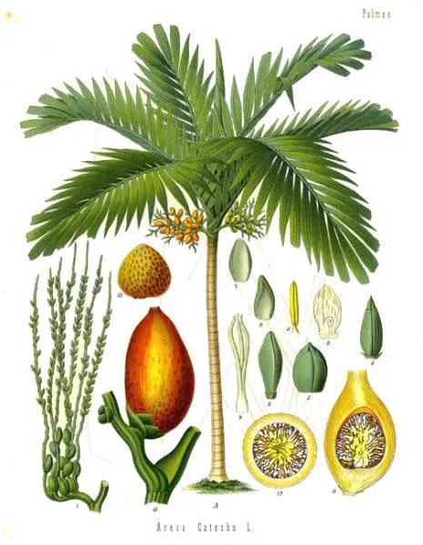 槟榔(学名:Areca catechu),别名傧郎、宾门、螺果、仁频、仁榔、洗瘴丹、仙瘴丹、台湾口香糖,与椰子同属棕榈科常绿乔木,主干可长至二十米。“槟榔”一词源于马来语“pinang”。槟榔原产于马来西亚,分布区域涵盖亚洲斯里兰卡、泰国、印度等热带地区、东非及大洋洲,素有“南国嘉果解万忧”的美谈。