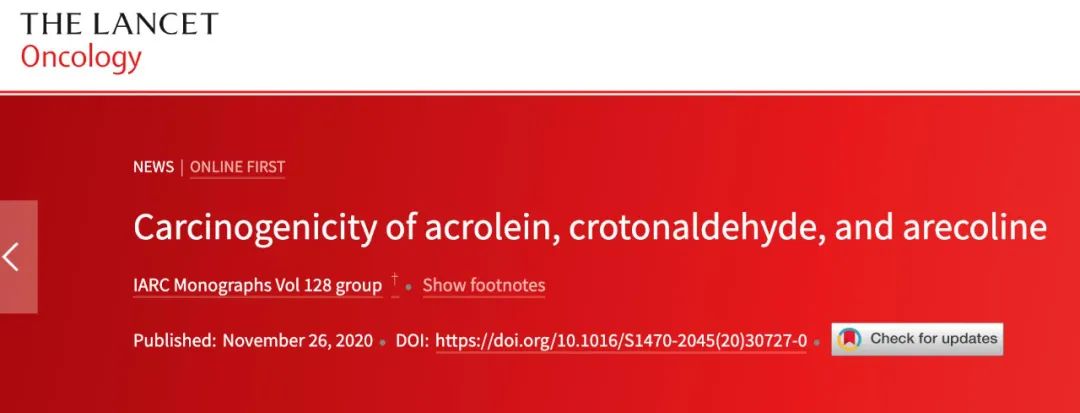 Carcinogenicity of acrolein, crotonaldehyde, and arecoline,DOI:https://doi.org/10.1016/S1470-2045(20)30727-0