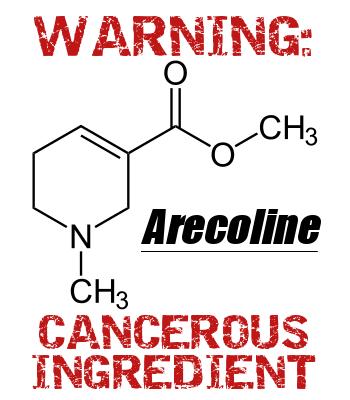 槟榔碱是槟榔的主要活性成分,曾被用做驱虫药。因其易吸收,因此可在槟榔咀嚼者的唾液、血液、尿液、头发甚至乳汁中检出。槟榔碱还能与亚硝酸钠反应生成N-亚硝胺,后者是另一类已被确定的致癌物,并可在咀嚼槟榔的人唾液中检测到。