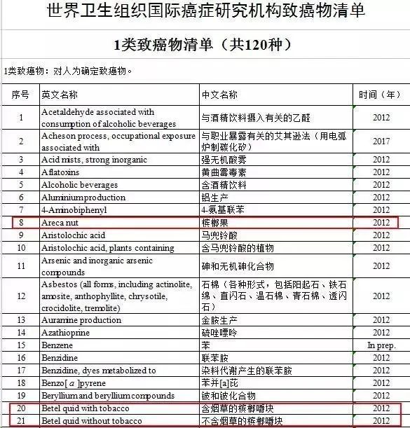 事实上,早在2003年,WHO下属国际癌症研究中心(IARC)就在总结了上百篇槟榔相关研究报告后,将槟榔定为一类致癌物,即对人明确可以致癌的物质。
