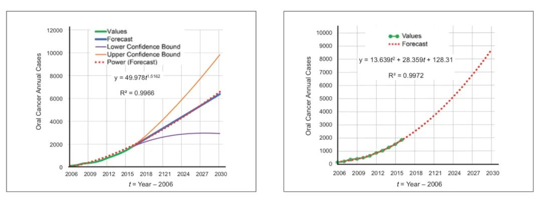 使用不同模型预测长沙市口腔癌病例的增长情况。Trend Analysis of Betel Nut-associated Oral Cancer and Health Burden in China. Chin J Dent Res. 2017;20(2):69-78. doi: 10.3290/j.cjdr.a38271.