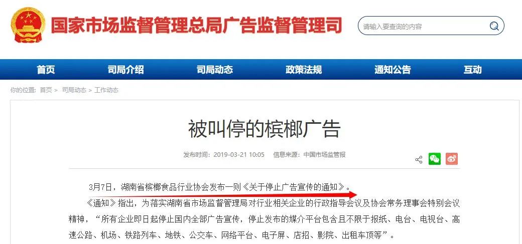 去年3月,“湖南槟榔行业协会”也曾发布通知要求全面禁止槟榔广告。《通知》指出,为落实湖南省市场监督管理局对行业相关企业的行政指导会议及协会常务理事会特别会议精神,“所有企业即日起停止国内全部广告宣传,停止发布的媒介平台包含且不限于报纸、电台、电视台、高速公路、机场、铁路列车、地铁、公交车、网络平台、电子屏、店招、影院、出租车顶等”。《通知》强调,此项工作必须在3月15日前全部完成,“对未按要求落实相关工作任务的企业,市场监管部门将取证并采取相应措施”。