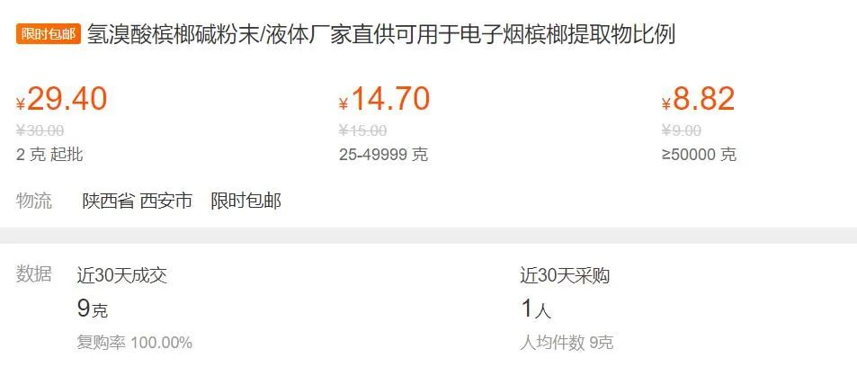 某购物网站上的氢溴酸槟榔碱售卖信息。@Dr. Du