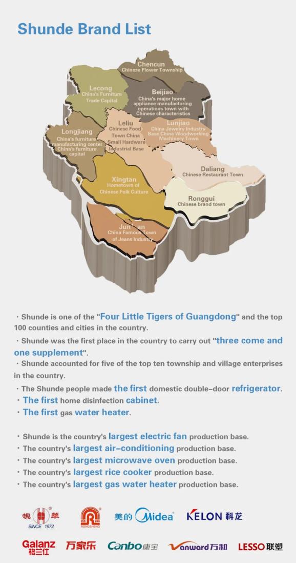 In those years, Shunde was the largest household electrical appliances production base in China, with its own production accounting for 25% of the country. Many people know Shunde from the well-known trademarks, such as Xianhua, Rongsheng, Midea, Kelon, Galanz, Macro, Kangbao, Vanward, and Lesso.