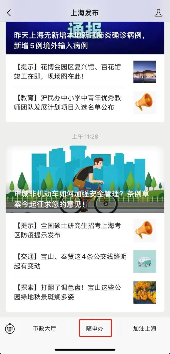 ①进入“上海发布”微信主页,点击“随申办”按钮。