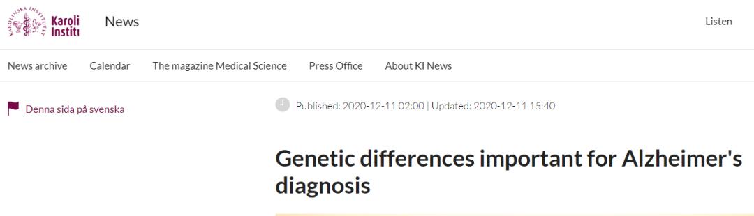 “大脑和脑脊液中生物标志物的结果差异提供了独特的生物学信息,并为将来更早和更个性化的诊断和治疗阿尔茨海默病提供了机会。该结果对于设计针对大脑淀粉样蛋白积聚的新药的临床试验设计也很重要。”卡罗林斯卡学院神经生物学、关怀科学与社会学系的高级研究员、论文通信作者Elena Rodriguez-Vieitez说。参考文献