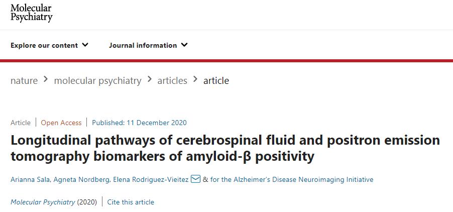 Sala, A., Nordberg, A., Rodriguez-Vieitez, E. et al. Longitudinal pathways of cerebrospinal fluid and positron emission tomography biomarkers of amyloid-β positivity. Mol Psychiatry (2020). https://doi.org/10.1038/s41380-020-00950-w