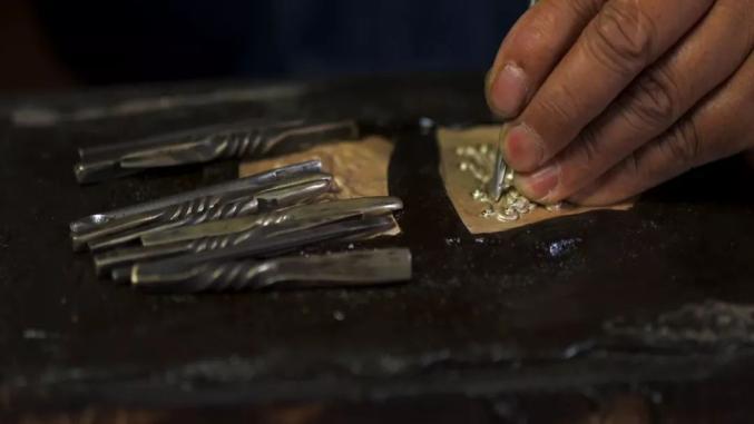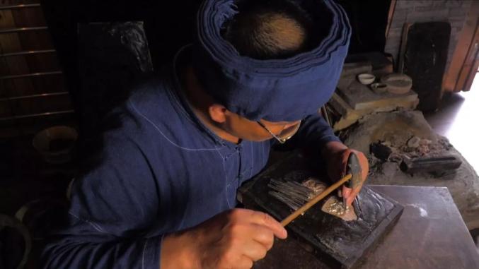 先将凝固的热银锤打紧实,再捶打成四方形长条,最后将银条捶打成直径3毫米的圆柱状细条。