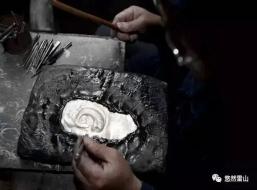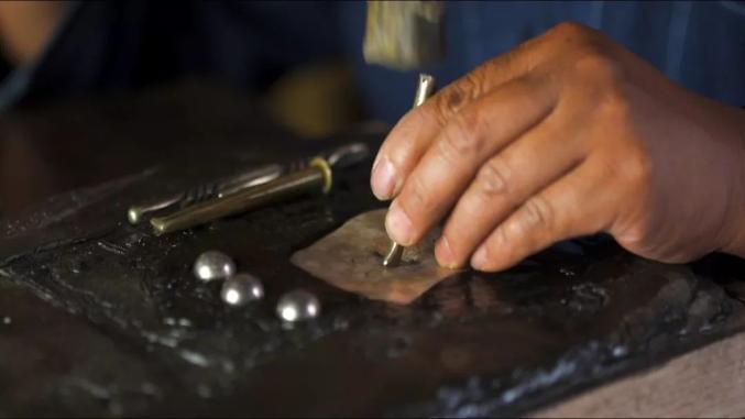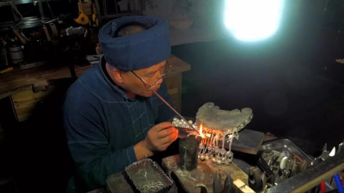 将事先手工打磨好的银珠摆放在需要镶嵌的位置,然后用焊枪整体加温。该过程需要严格控制温度,温度高则熔断银丝,温度低则镶嵌不牢固。