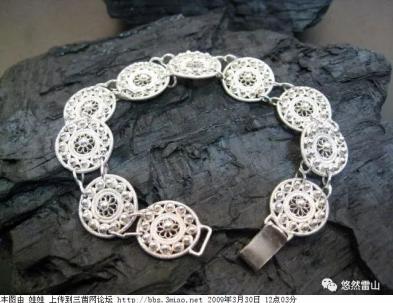 将捶打好的细银条用矬子做好尖头,再用拉丝眼板拉丝。拉丝眼板一般分52个直径不同的眼孔,若一根银条经过52次拉丝,那么其直径与一根人的发丝差不多。