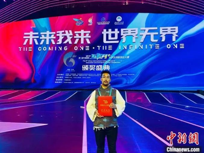 图为拉东参加“建行杯”第六届中国国际“互联网+”大学生创新创业大赛颁奖典礼。受访者供图近日,随着四川省甘孜州理塘县藏族小伙丁真的爆火,当地文旅等产业得到快速发展,扶贫效益显著增强。
