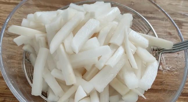 6、再把萝卜清洗几遍,去除萝卜的辛辣味,再沥干水分备用 。