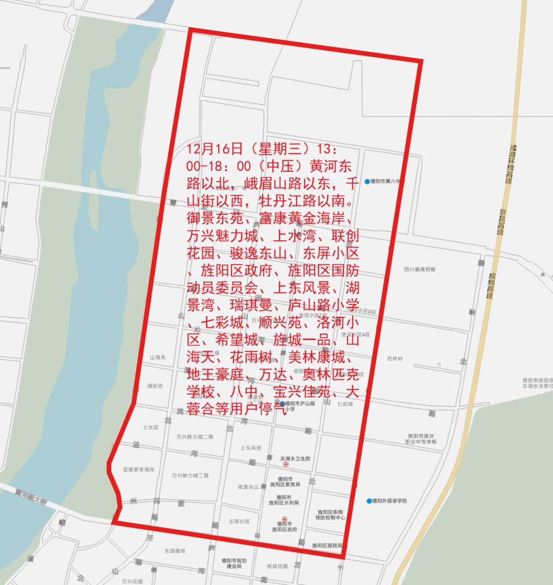 2、12月16日(星期三)13:00-18:00(中压)黄河东路以北,峨眉山路以东,千山街以西,牡丹江路以南。御景东苑、富康黄金海岸、万兴魅力城、上水湾、联创花园、骏逸东山、东屏小区、旌阳区政府、旌阳区国防动员委员会、上东风景、湖景湾、瑞琪曼、庐山路小学、七彩城、顺兴苑、洛河小区、希望城、旌城一品、山海天、花雨树、美林康城、地王豪庭、万达、奥林匹克学校、八中、宝兴佳苑、大蓉合等用户停气;