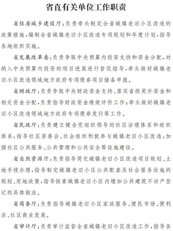 (一)加强统筹协调。将城镇老旧小区改造作为全省城市功能与品质提升重要工作内容,由省城市功能与品质提升工作领导小组统筹协调推动全省城镇老旧小区改造工作,各有关单位按照领导小组工作要求和职责分工,加强政策协调、工作衔接、调研督导,及时发现新情况新问题,研究完善相关政策措施。