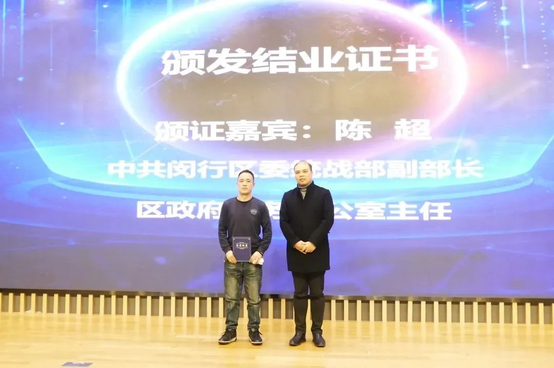 闵行区委统战部副部长、区政府侨办主任陈超为2020海外高层次人才创新创业研习班学员代表胡治军博士颁发结业证书。胡治军表示,“闵行是片创新创业的热土,莘庄工业区更是吸引人大展拳脚的最佳阵地,这次大赛既是竞争更是学习,非常期待海创班学员和项目在未来走得更远,也期待灵鹰长空项目能尽快落户工业区。”