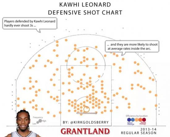 哈佛大学访问学者柯克•格斯贝瑞(Kirk Goldsberry)团队曾发布一套新的算法,可通过NBA球员的动作追踪数据,分析该球员的防守效果。例如在科怀•伦纳德(Kawhi Leonard)的防守下,基本不可能在三分线外出手投篮;若防守者换成克里斯•保罗(Chris Paul),不仅在任何位置都很难投篮,即使投出去也很难命中。