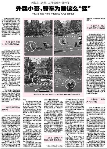 在我们的日常生活中,外卖、快递骑手成为我们城市中非机动车中一支数量很大的队伍,每天为广大市民提供了大量的服务,满足了人们的生活需求,但不少骑手为了少花时间多跑业务,往往出现闯红灯、逆向行驶、占用机动车道等严重交通违法行为,存在着极大的交通安全隐患。为此,沧州交警坚持宣传与整治相结合的方式,不断加强外卖,快递员的交通违法行为管理。10日,沧州晚报针对我市治理外卖快递交通违法情况刊发了一整版题为《卖小哥,骑车为啥这么“猛”》的报道。