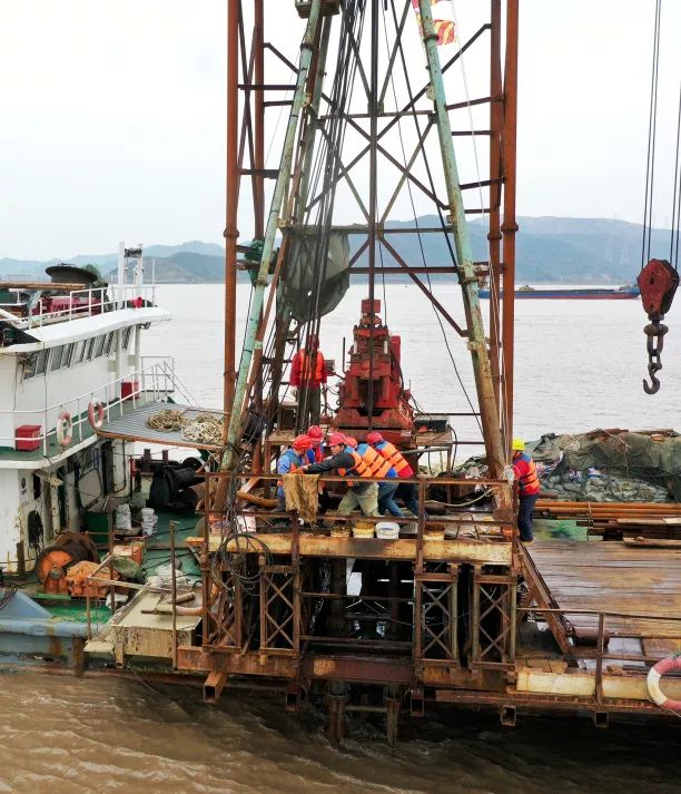 2020年1月2日中午,舟山市定海区册子岛海岸外的西堠门水道上,工人们正在勘探船上进行地质钻探。通讯员 姚峰 摄甬舟铁路将创造“一桥一隧”两个世界级工程。