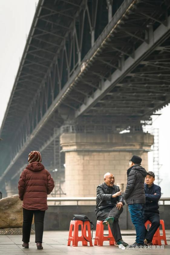 武汉长江大桥下面的空地,婆婆们在跳舞,爹爹们在下棋,起得早的小伢围在一起玩游戏。