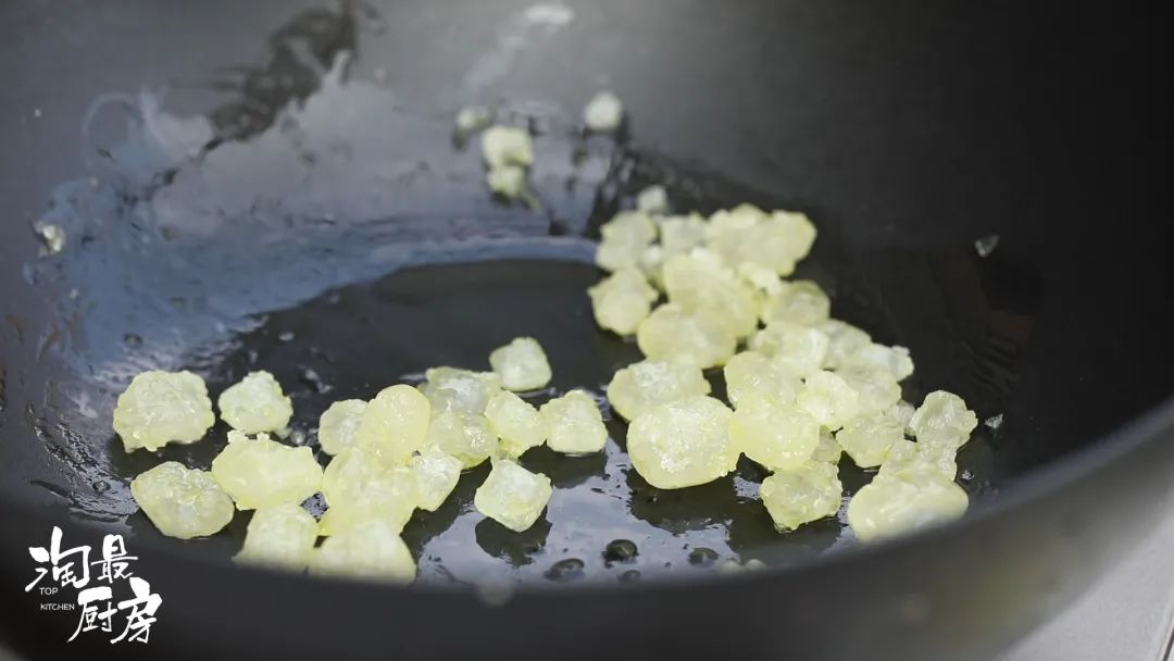 开小火,锅内加入1调羹油和1/3碗冰糖,不停搅和炒至融化。