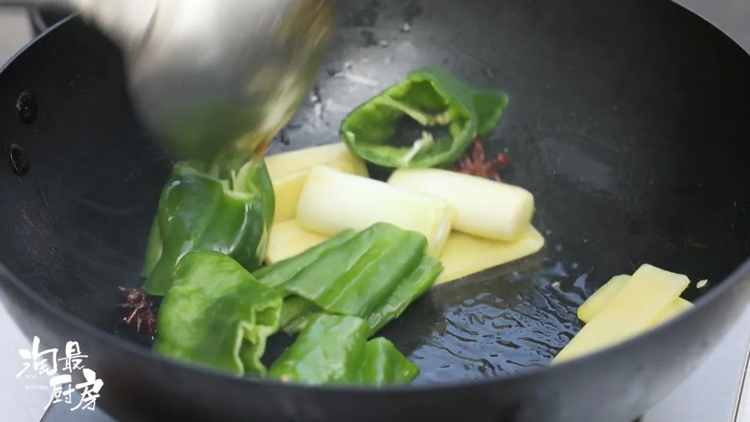 开大火,锅内加入2调羹油、3片姜、2个八角、1个青椒和2段京葱一起翻炒。