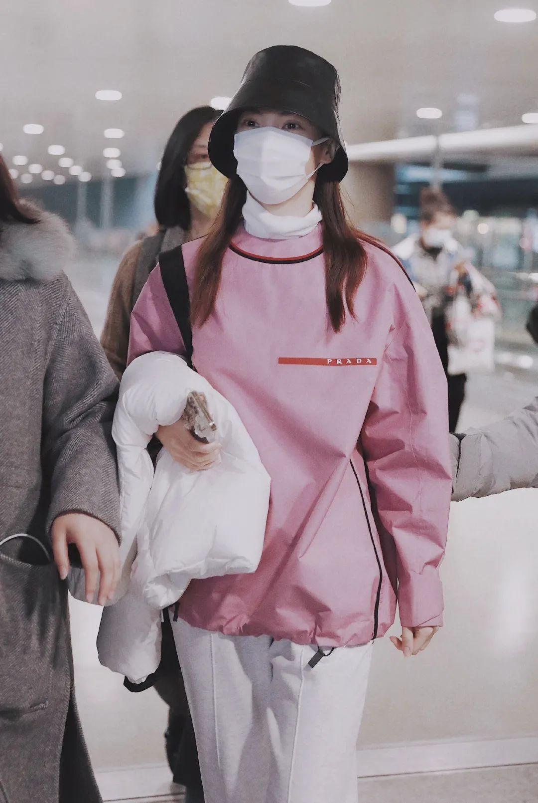 灰粉色的夹克套头衫内搭高领白色打底,整体走的运动舒适风。不想要太过少女又想选择粉色单品的宝贝们可以看看金晨的搭配哦!