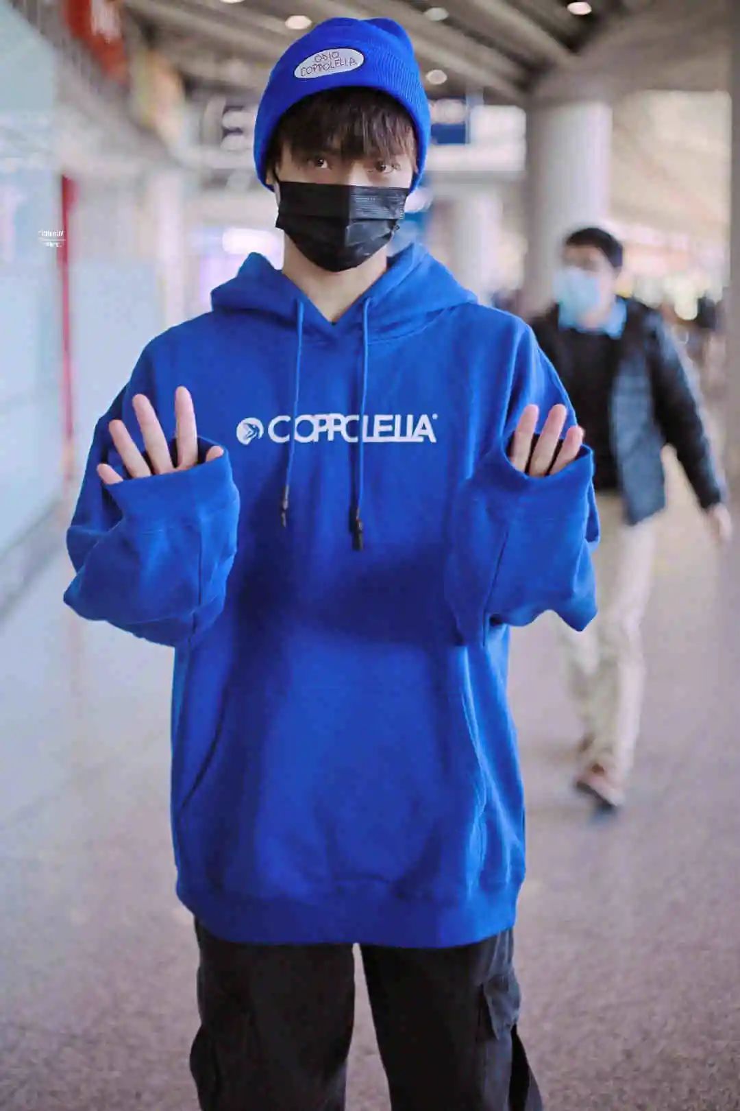 宝蓝色的卫衣搭配工装裤是日常绝不会出错的男孩搭配方式,搭配一顶同色毛线帽既可保温,又可增加造型完整度。不过面对镜头的李振宁弟弟好像有意思害羞内?