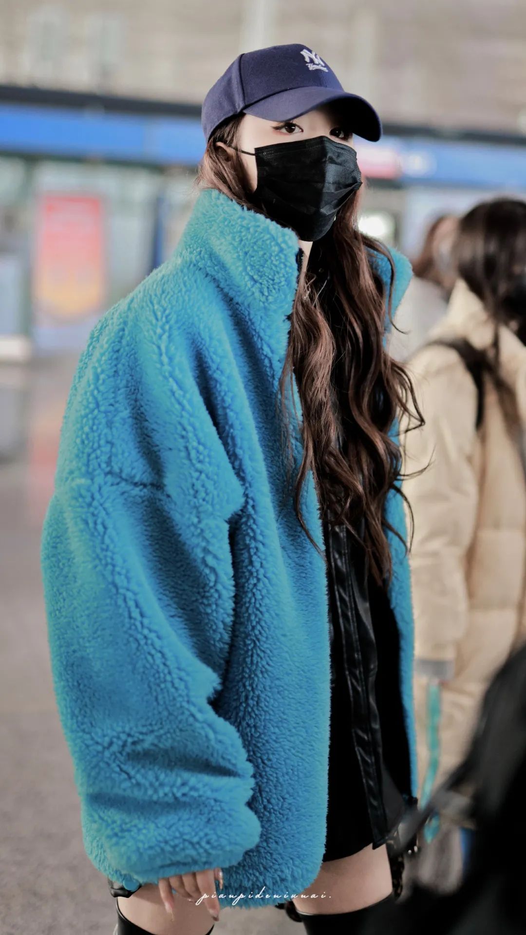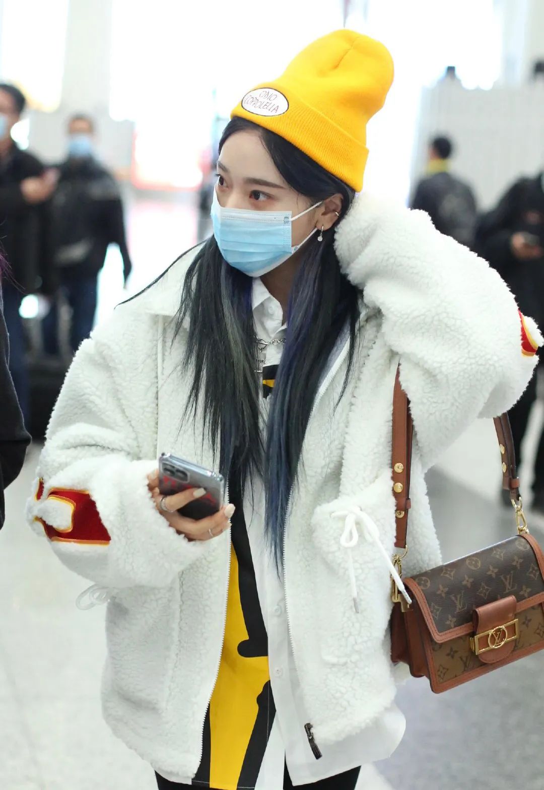 羊羔毛外搭是今年众多女明星喜爱的元素,一来是保暖二来是材质力推风格也很可爱。张紫宁的这件羊羔毛外套袖子上有亮眼的火焰图案设计,搭配一顶亮黄色毛线帽,活力满分!