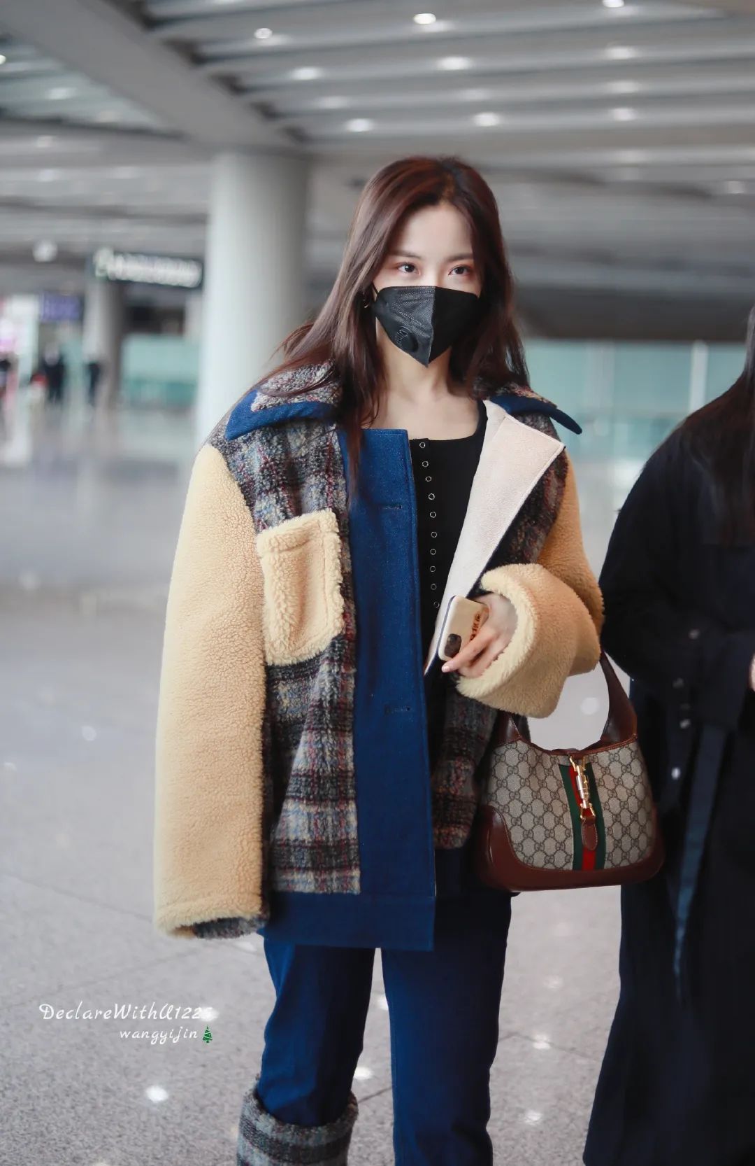 冬天怎么可以不毛绒绒~ 王艺瑾就做出了很好的示范穿搭,羊羔毛拼接夹克内搭黑色开衫,与外套同系列的裤子,裤尾与外套的格子拼接相呼应,整个人看着暖融融却不显臃肿,手提老花包,又多了一丝复古的感觉~