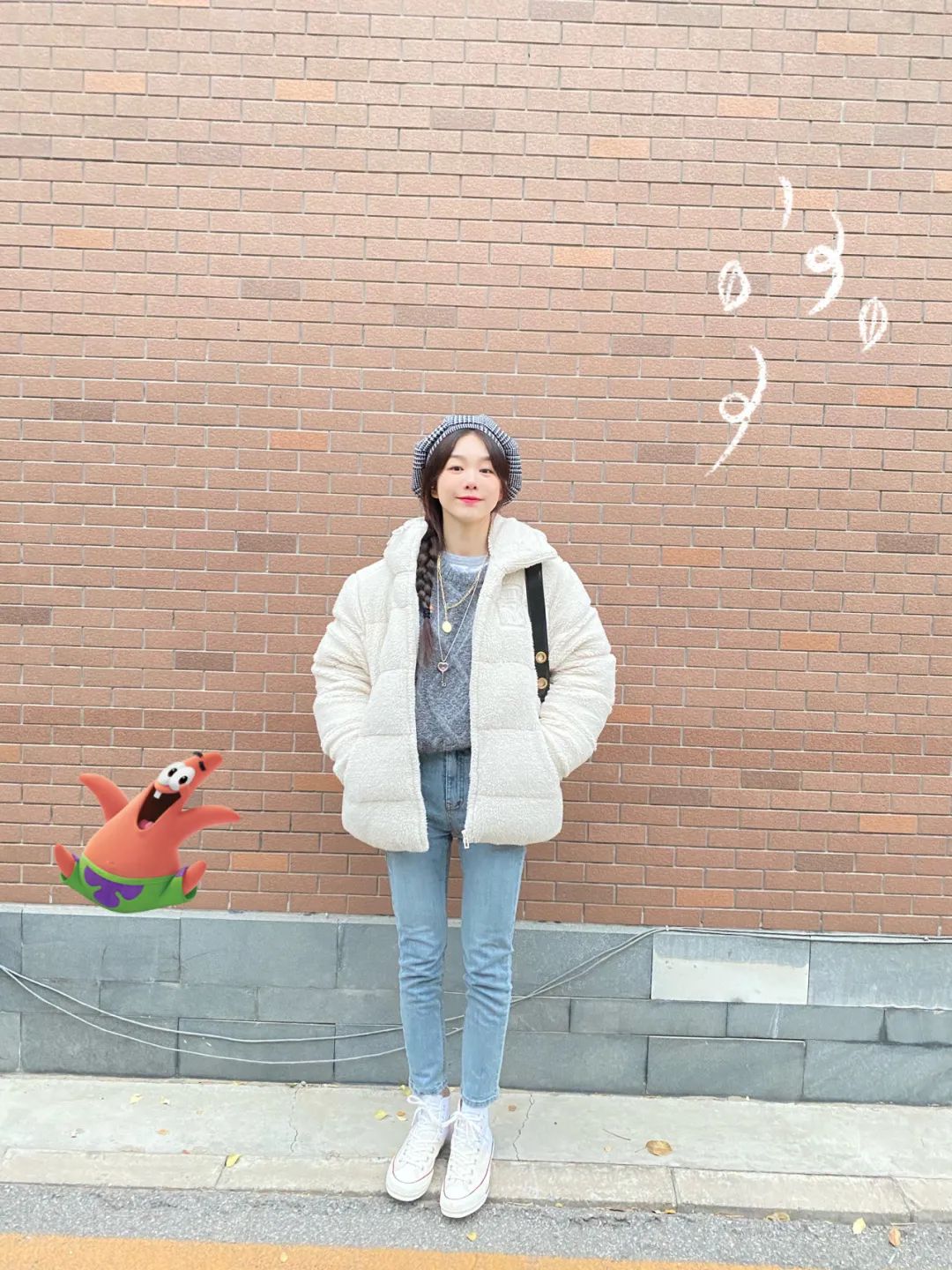 希林娜依高这件小白羽绒服出镜率还蛮高的,这次内搭则改成了宝蓝色的毛衣,大篇幅的撞色文字很有美式气息,工装裤的左右两束飘带非常有设计感。