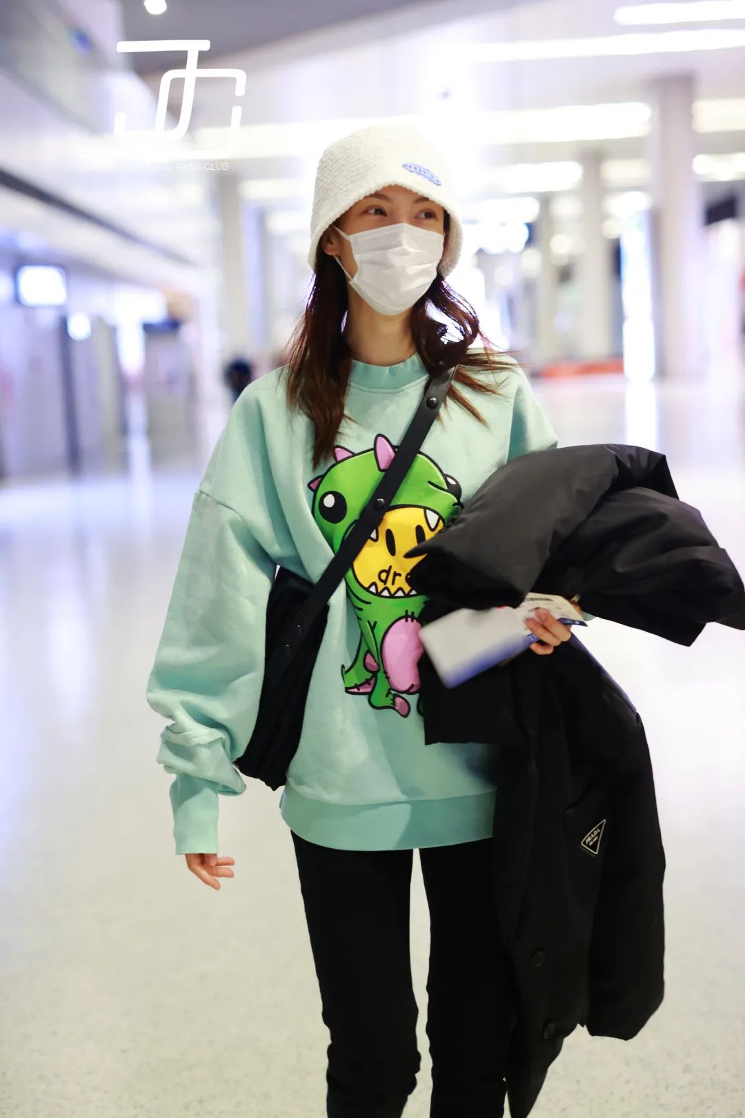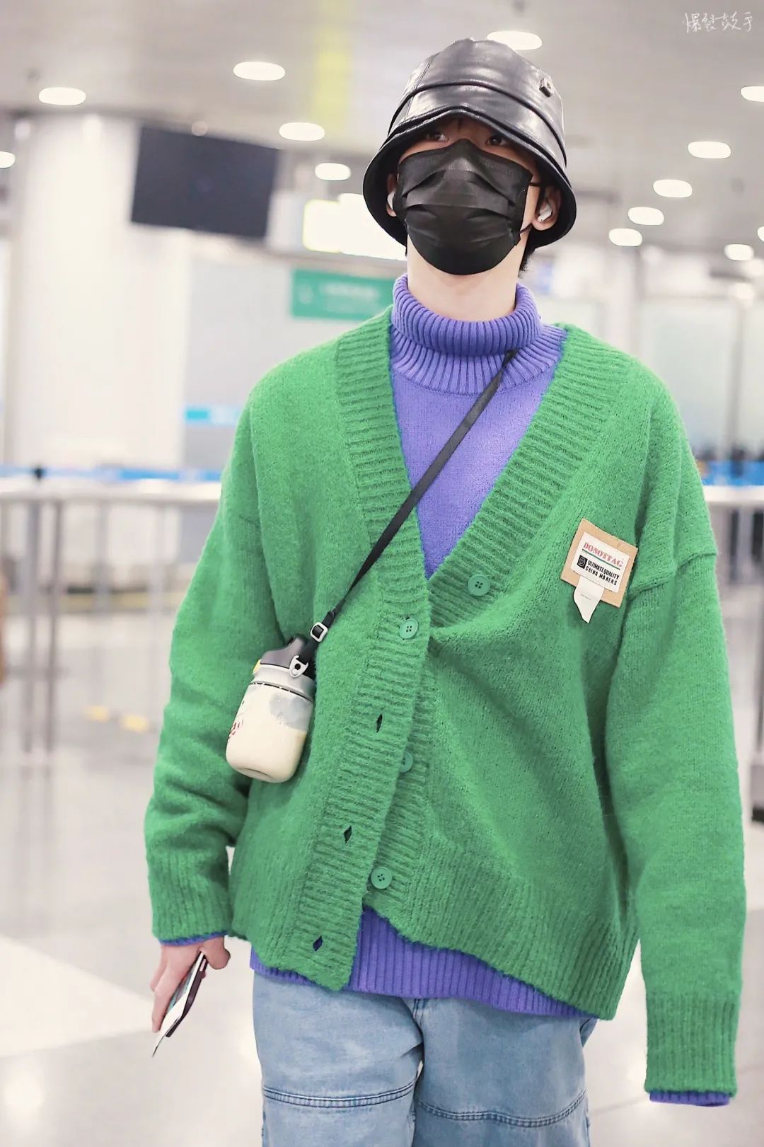如果不放大看小编还以为胡宇桐同学挎了一个奶瓶��紫色毛衣和绿色毛衣开衫的撞色叠穿很有风格,加上故意错扣的纽扣,加重了层次感,颜色很鲜亮,又暖和~