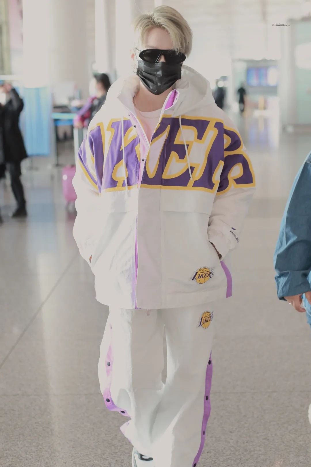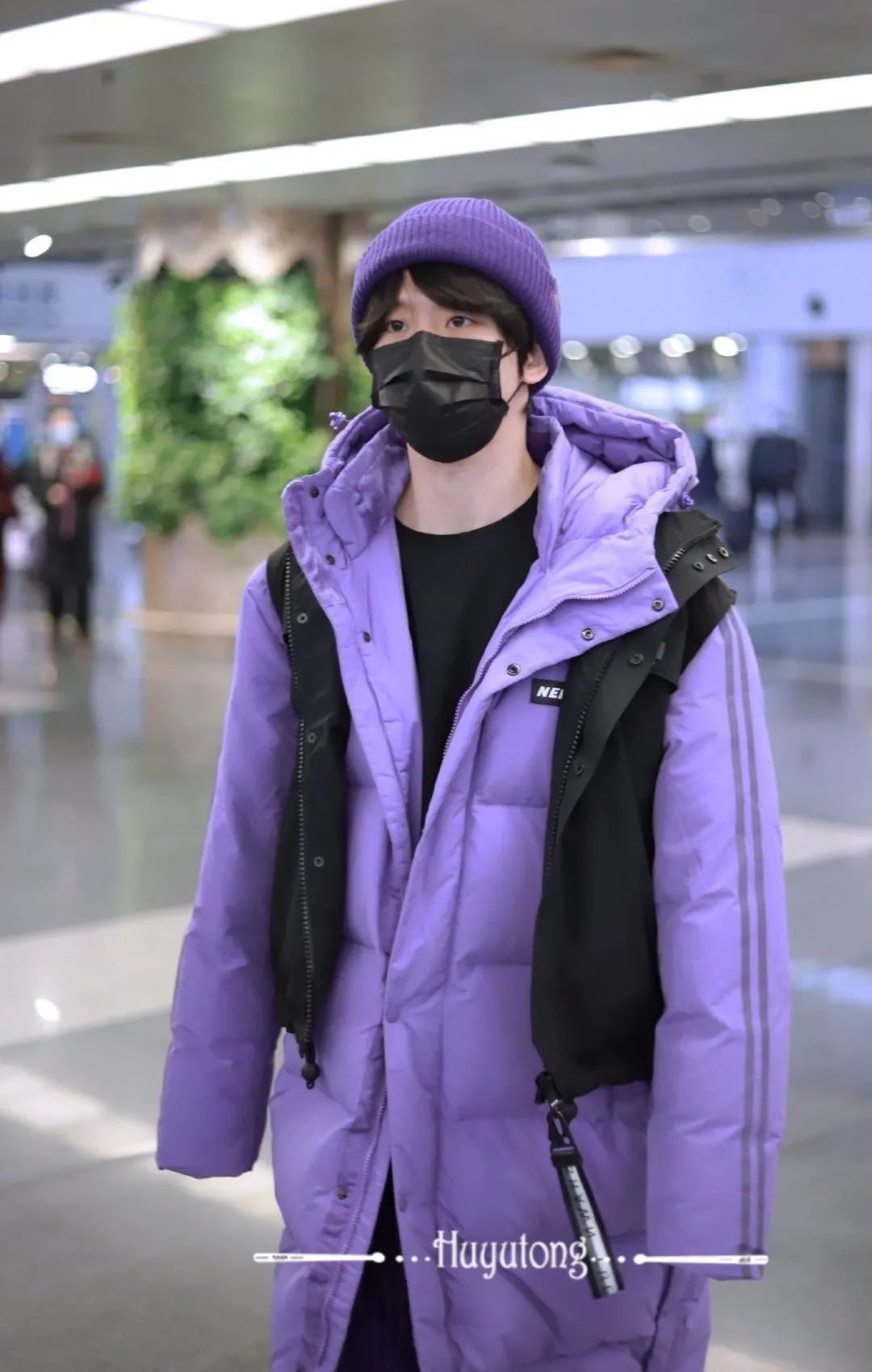 胡宇桐真的是个不甘愿被黑色禁锢住的文艺人,上面的颜色处处有他,自然紫色这里也不甘示弱。Nerdy的长款羽绒服带有韩剧欧巴的校园青春感,再外搭一件黑色羽绒背心,其他单品也很有心的不是紫色就是黑色,在视觉上非常平衡,风格也很潮很运动~
