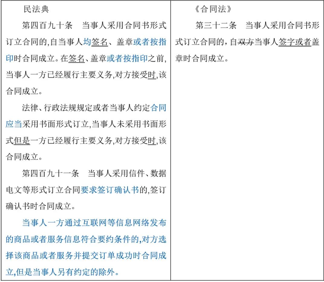 合同修改要点说明该条规定增加了“或者按指印”的合同成立方式,以及“一方以实际行动履行主要义务,对方接受时,合同成立”的规定。