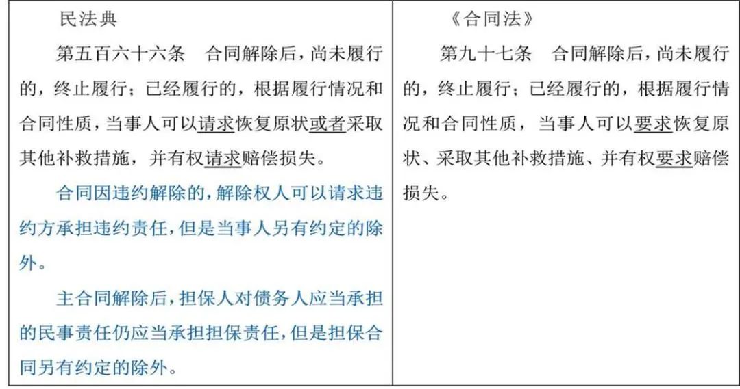 合同修改要点说明该条规定较原《合同法》而言,增加了合同解除后违约方的违约责任,以及进一步明确了担保人的担保责任。