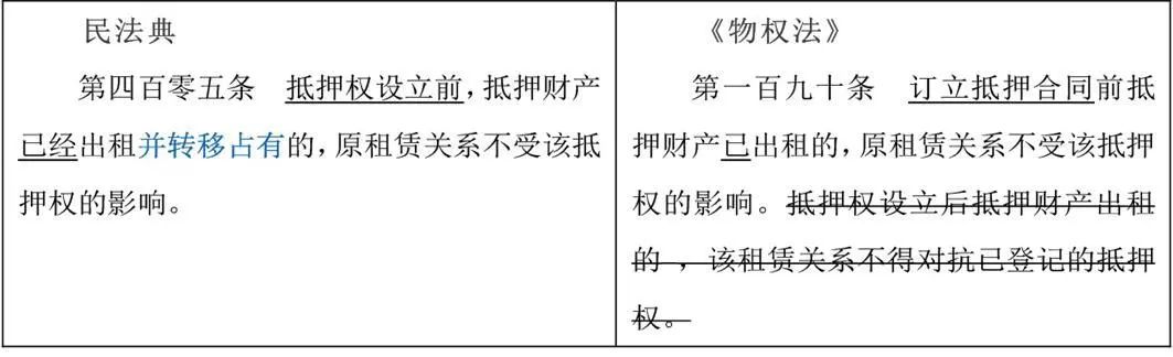 该条虽然删除了“抵押权设立后抵押财产出租的,该租赁关系不得对抗已登记的抵押权”的规定,但并不影响该条的适用,因为通过现有条文的反向解释同样可以得到“后设立的租赁关系不得对抗已登记的抵押权”的规则。因此建议银行在设立抵押权时,应该重点关注抵押财产是否已经出租。