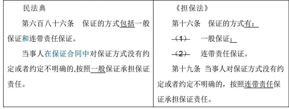 合同修改要点说明民法典将“按照连带责任保证承担保证责任”改为“按照一般保证承担保证责任”,属于根本性原则性的变化,因此,建议银行必须在保证合同中明确约定保证方式为连带责任保证。