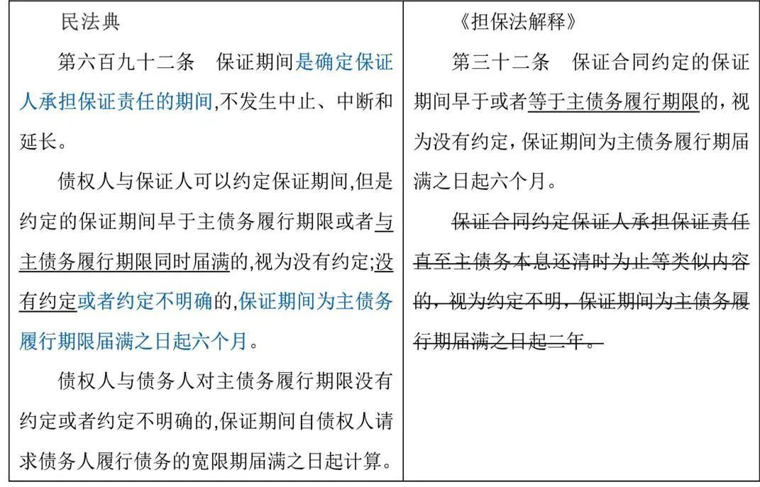 合同修改要点说明民法典将保证期间约定不明确,“保证期间为主债务履行期届满之日起二年”缩短到“主债务履行期限届满之日起六个月”,因此建议银行应在保证合同中明确约定保证期限,当出现未约定保证期限的情况时,及时主张权利。