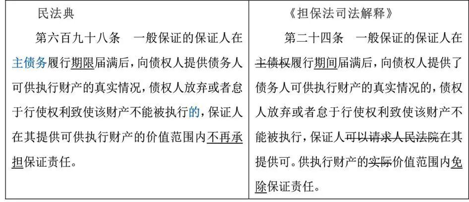 合同修改要点说明该条款约定:“保证人向债权人提供债务人可供执行财产的真实情况,债权人放弃或者怠于行使权利致使该财产不能被执行的,保证人在其提供可供执行财产的价值范围内不再承担保证责任。”但是在实践中,保证人提供可供执行财产的真实情况,银行很难进行判断,为此保证人不再承担保证责任,不利于银行利益,因此建议银行在合同中约定“一般保证的保证人/连带责任保证人,保证人向债权人提供债务人可供执行财产的真实情况后,银行未执行相应财产的,保证人仍应在其提供执行财产的价值范围内承担保证责任。”