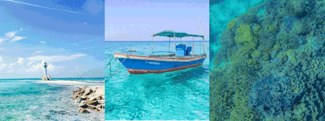 海水的色彩从深蓝慢慢过渡到碧蓝、浅蓝、泛白、亮白,珊瑚贝壳,配合着犹如混合了奶油一般的马卡龙色海水,美得连心都要醉了。