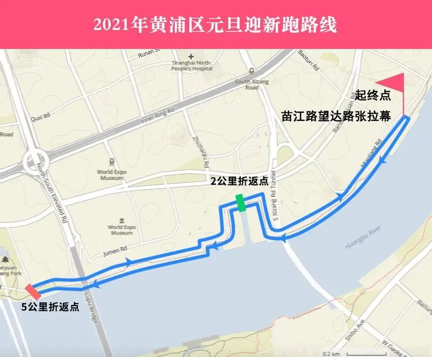 活动路线迎新健康跑(5.0公里):黄浦滨江张拉幕(起终点)—黄浦滨江绿道—远望号—滨江南园公园(折返)
