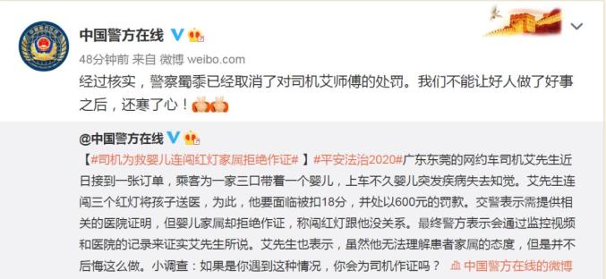 14日,公安部新闻中心官方微博@中国警方在线 称:经过核实,警察蜀黍已经取消了对司机艾师傅的处罚。我们不能让好人做了好事之后,还寒了心!