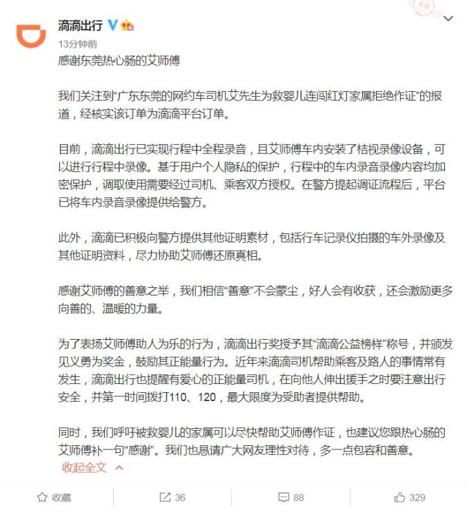 平台:已将车内录音录像提供给警方对于此事,@滴滴出行发文表示,感谢东莞热心肠的艾师傅。
