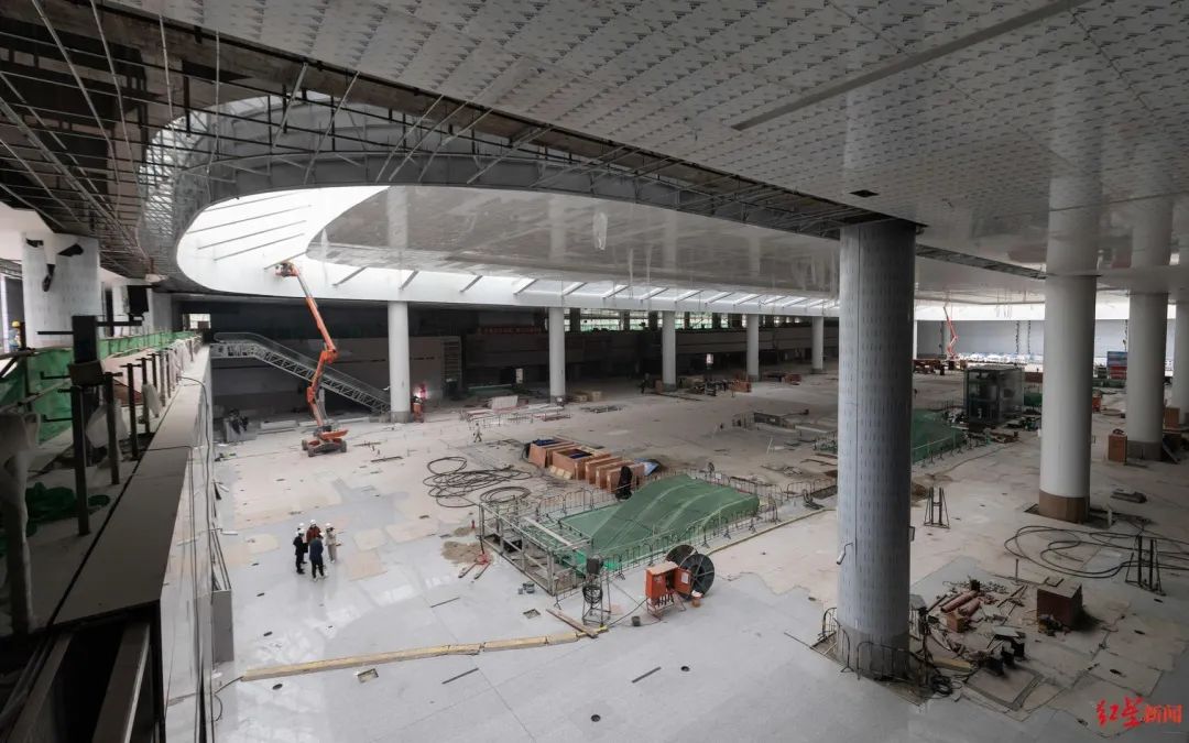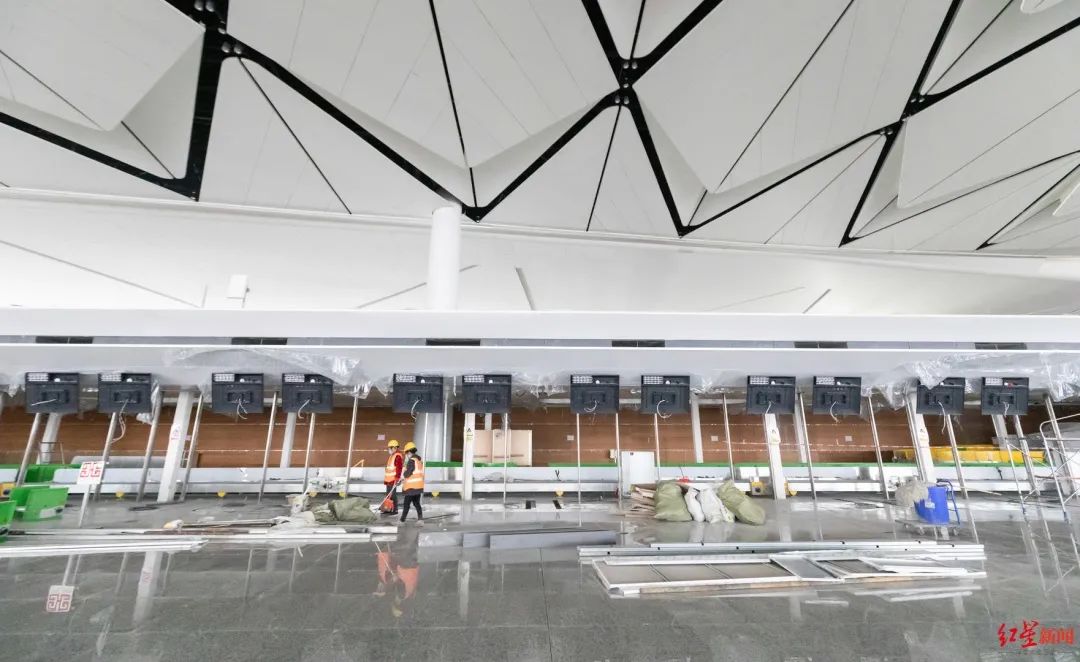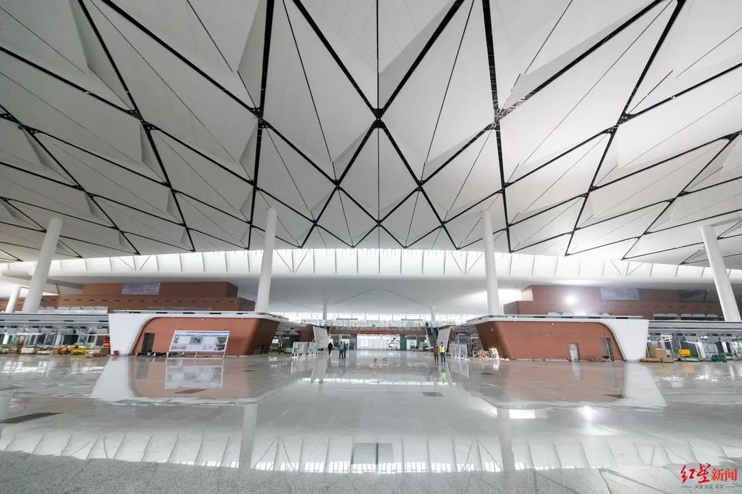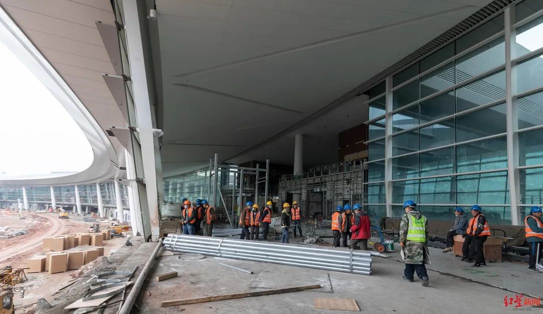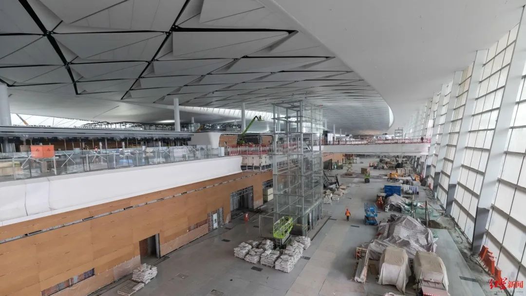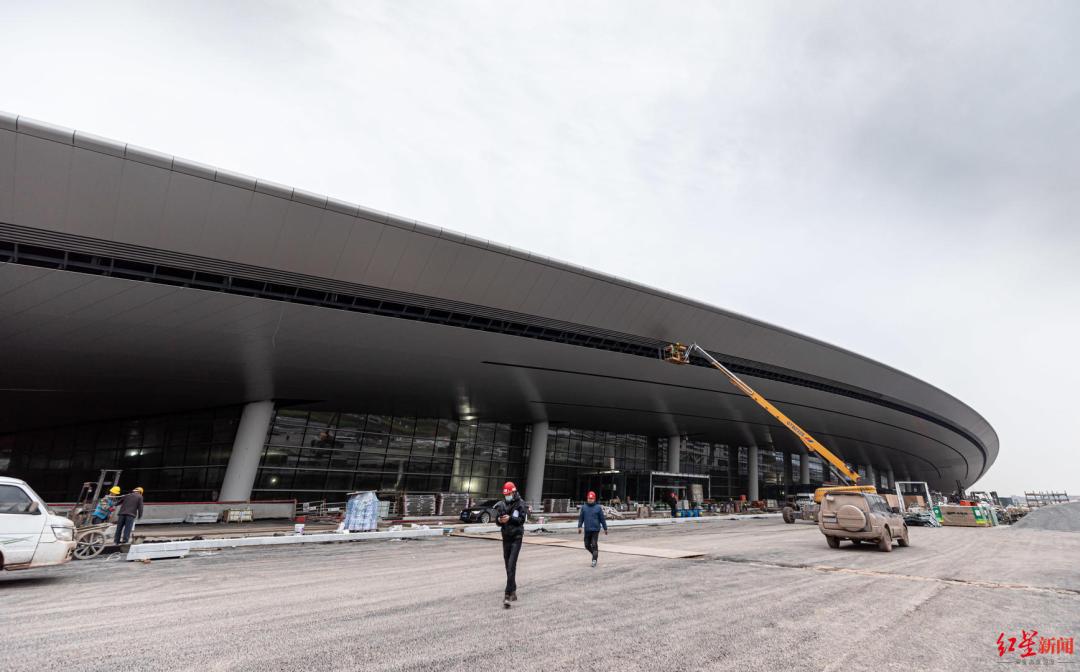 近日,红星新闻记者一行驱车来到位于成都东部新区的建设现场,顺着高架桥乘车而上。施工人员站在登高车上,进行玻璃幕墙的收尾作业。跟其他机场一样,下车后步行通过连廊进入航站楼。