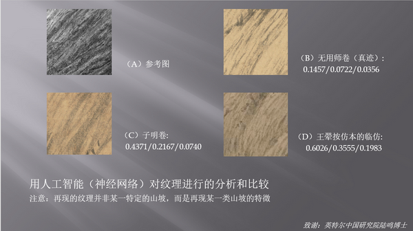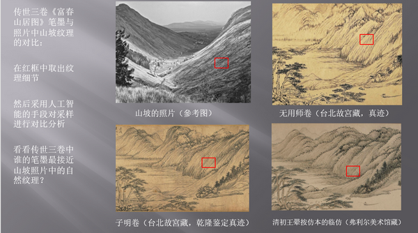 他以传世三卷《富春山居图》无用师卷笔墨与一幅照片中山坡纹理做对比。放入人工智能程序之后,台北故宫所藏黄公望真迹版描摹的纹理与现实中的山坡纹理最为接近,台北故宫所藏子明卷次之,弗利尔美术馆所藏清初王翚按仿本的临仿再次之。
