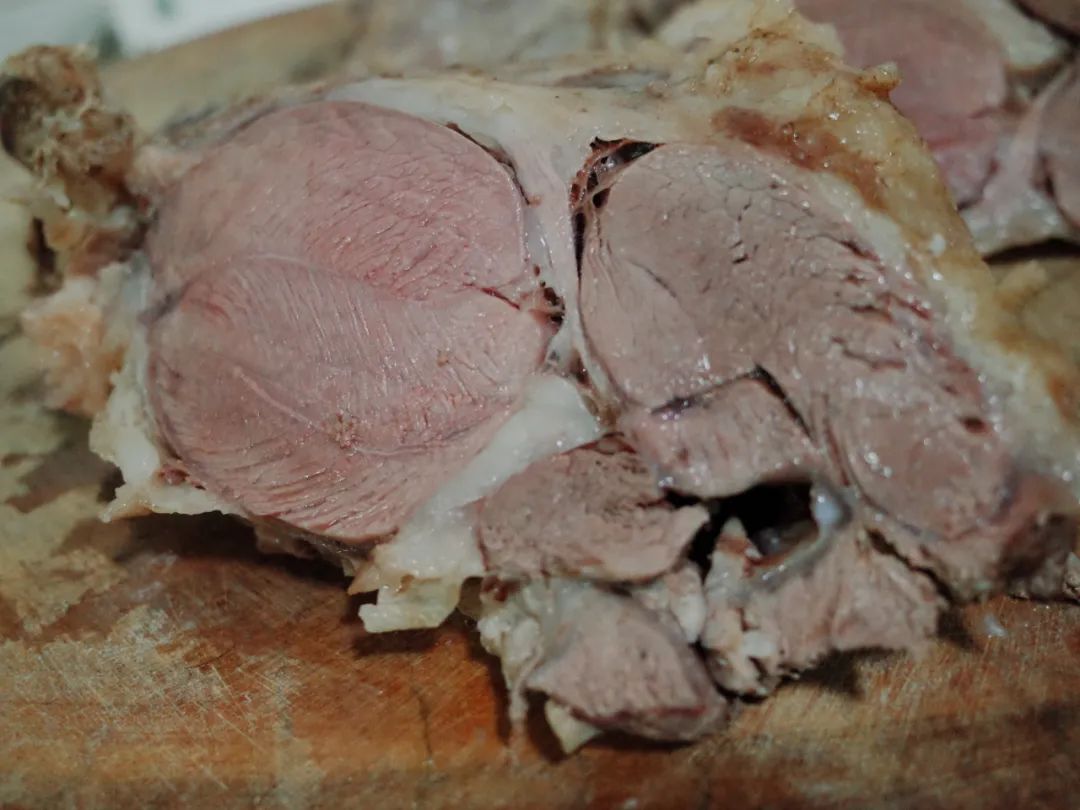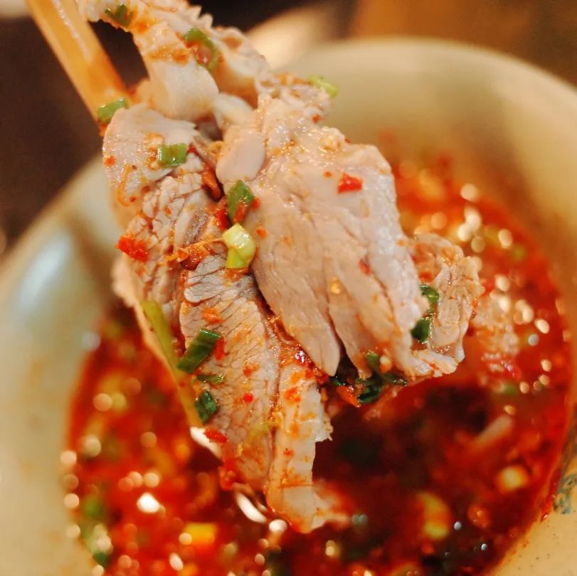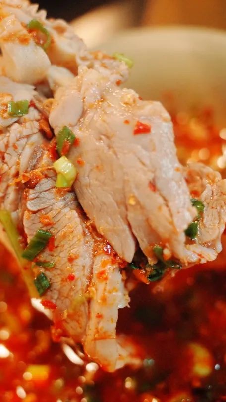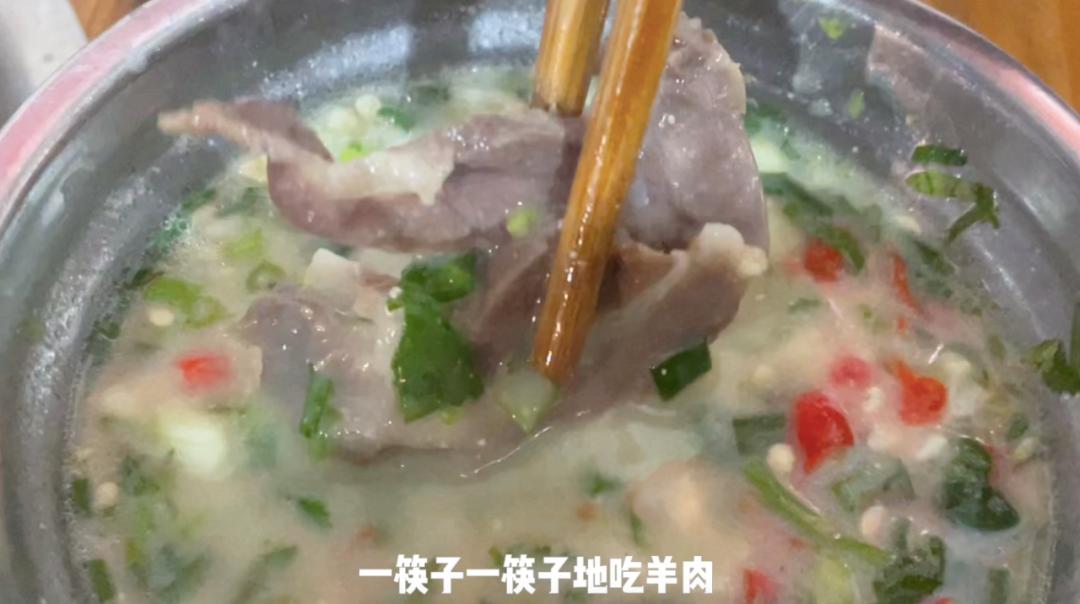 小天很好奇,只放花椒、八角的羊肉汤那味儿应该很大呀!可是一口下去,这汤并没有膻味,还伴随着花椒和八角的清香,汤汁浓郁,却不油腻,羊肉切开,鲜嫩多汁,纹路清晰,就着佐料放进嘴里,肉质韧嫩,软糯爆汁。