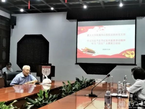 在支部书记朱敏的带领下,支部党员首先学习了习近平总书记系列重要讲话。随后,上海航天制造总厂的王炜副总设计师为支部党员讲述了中国载人航天的发展史,王侠生老主任结合自身经历讲述了华山皮肤科建立发展的历程。他表示,“从1956年科室只有2名党员到现在60余名党员,皮肤科的事业发展与党的事业发展是同向同行的。”