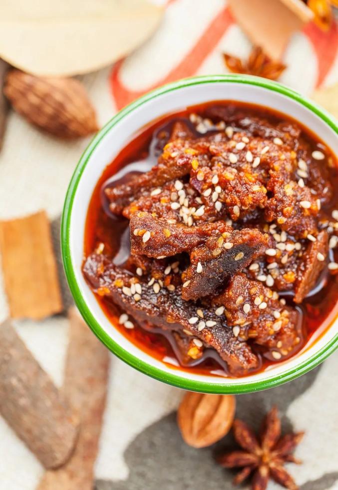 别看辣椒面小小一碟,却被苏稽人称为“跷脚牛肉的灵魂”——热气腾腾的牛肉蘸上鲜红的辣椒面,取的就是一个热闹喧嚣,这劲头真真显出川人本色。