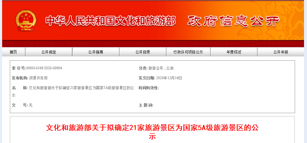 根据中华人民共和国国家标准《旅游景区质量等级的划分与评定》和《旅游景区质量等级管理办法》,经有关省(区、市)文化和旅游行政部门推荐,文化和旅游部按程序组织综合评定,以下21家旅游景区达到国家5A级旅游景区标准要求,拟确定为国家5A级旅游景区,现予公示。